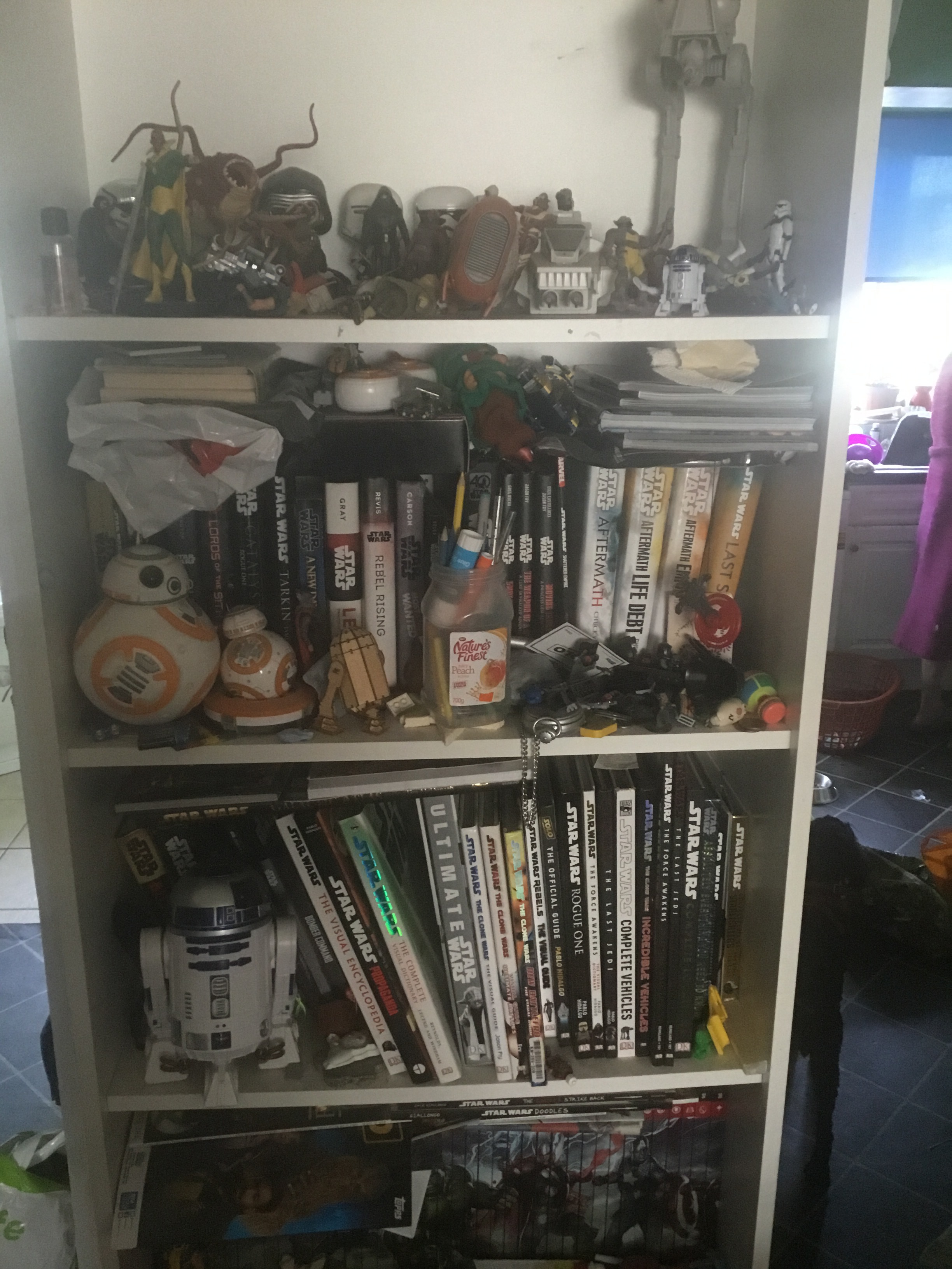 My Star Wars shelves, my smaller figures and the new canon books (and reference books) I have a few others, but those are near me since I haven’t read them yet.