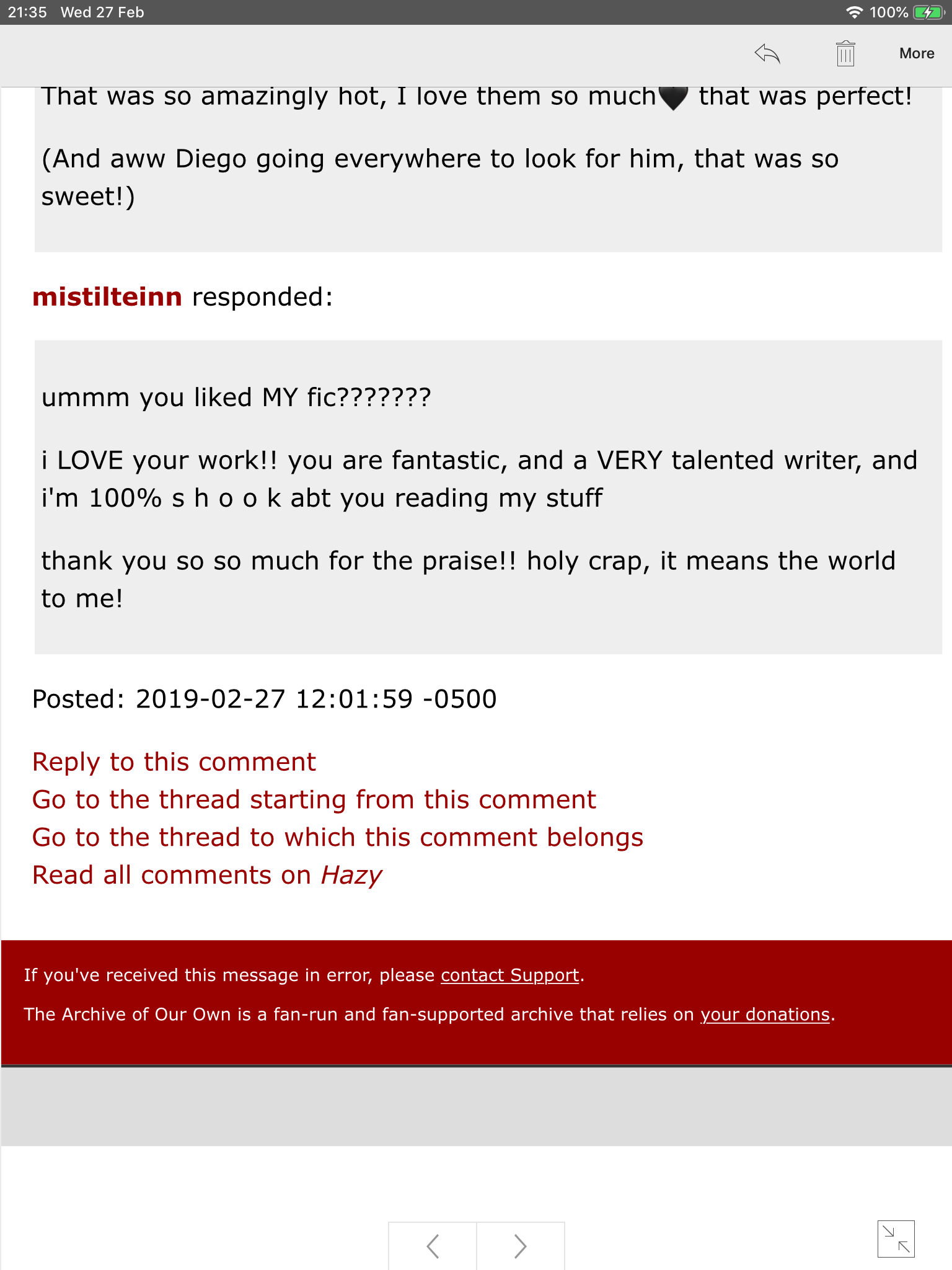 Now when I read that fic, I left a comment on it (like I do with everything I read on ao3 now). It was a Diego/Klaus (since I’m still very much down that rabbit hole). I was just checking my email and saw I had a reply back. Usually I just get replies that are along the lines of ‘thanks!’ but this one, this one made me smile so big because it was so sweet.